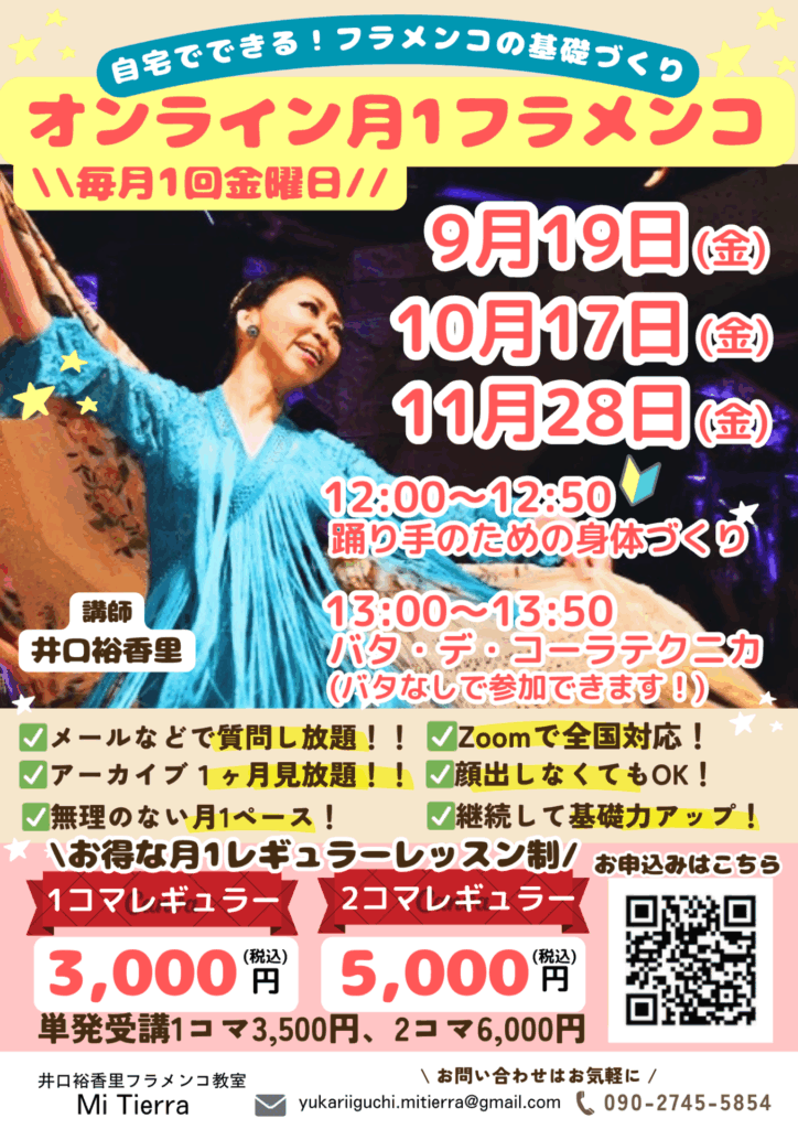 いかがでしたか?! オンラインを通して、どこにいても自分にとって必要なことを習得できる、 そして定期的にご受講頂くことで、日常的に、無理なく基礎のフラメンコ力を身につけていくことができるよう、このオンラインレッスンをフル活用して頂けましたら嬉しいです!