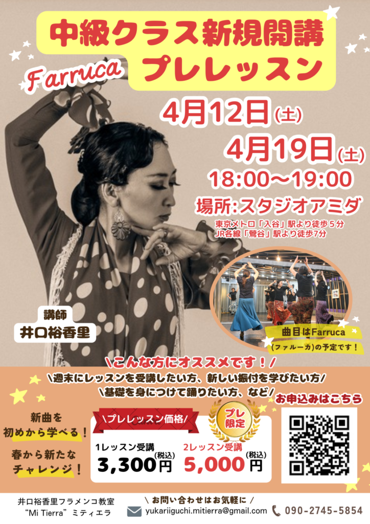 このレッスンは、5月より新規開講するフラメンコ経験者の方のためのクラスの、お試しレッスンです。